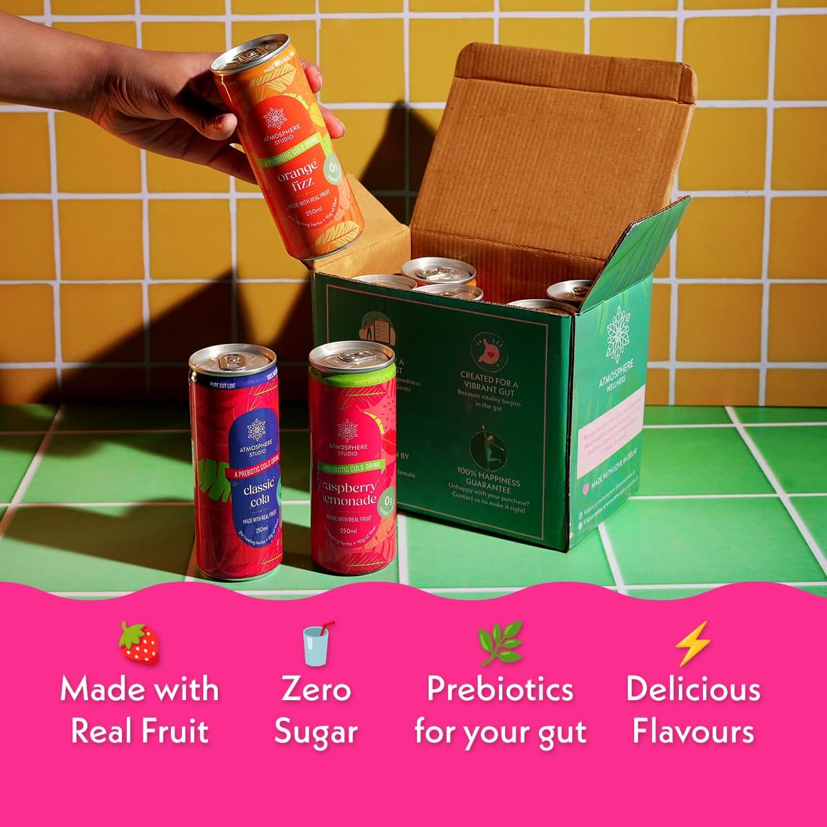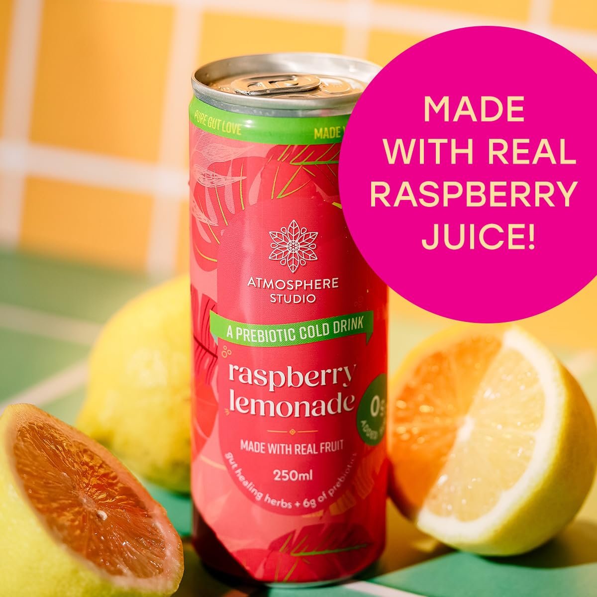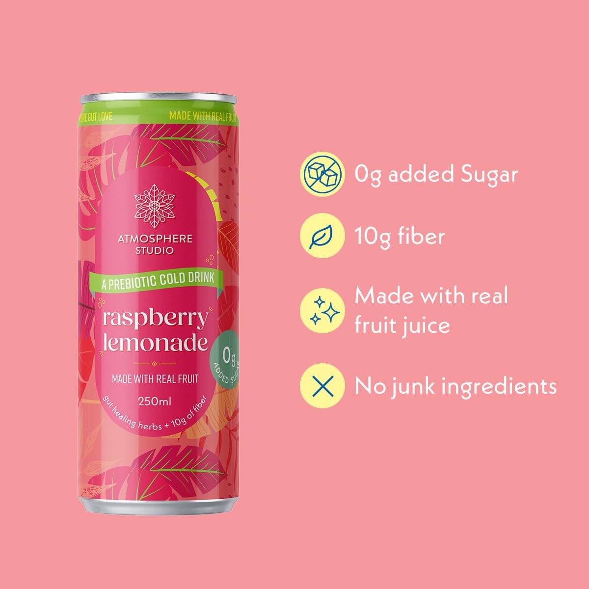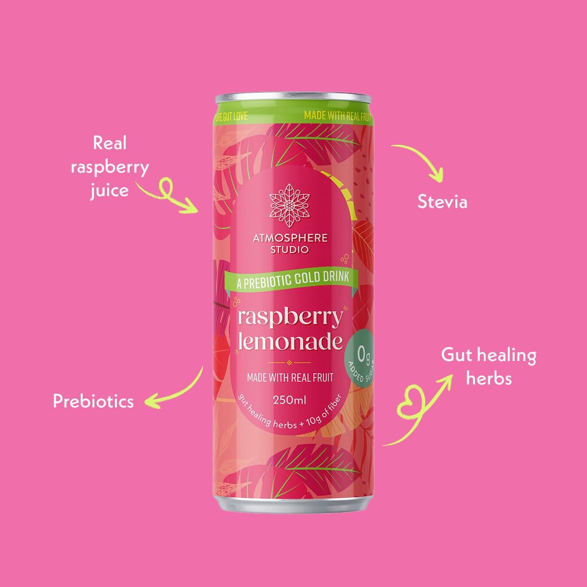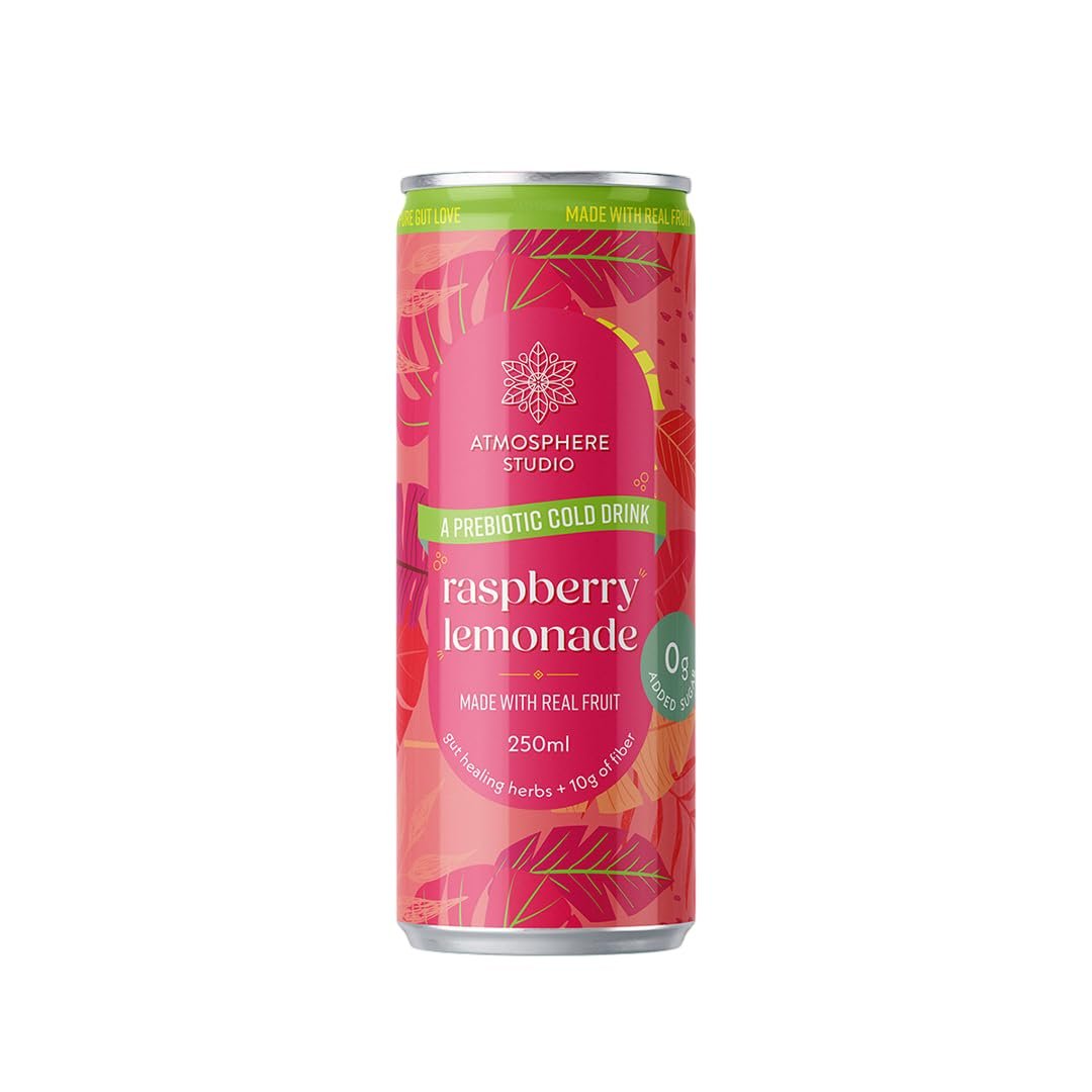 Details: Experience a delightful twist on classic lemonade with Atmosphere Studio’s Prebiotic Soda in Raspberry Lemonade flavour. This innovative beverage combines the nostalgic taste of sweet-tart lemonade with succulent raspberry juice, creating a refreshing fizzy drink that’s both delicious and beneficial for your wellbeing. What sets this 250ml drink apart is its thoughtful formulation – it contains no sugar, artificial sweeteners, or preservatives, yet delivers a perfectly balanced taste. Enhanced with plant-based prebiotics, this beverage supports your digestive health and microbiome. The addition of essential electrolytes helps maintain proper hydration levels, making it an ideal choice for any time of day. Whether you’re seeking a refreshing afternoon pick-me-up or a sophisticated alternative to traditional sodas, this prebiotic raspberry lemonade offers a guilt-free indulgence that’s both fizzy and functional. Perfect for those who appreciate the classic appeal of lemonade but desire the modern benefits of a wellness-focused beverage…