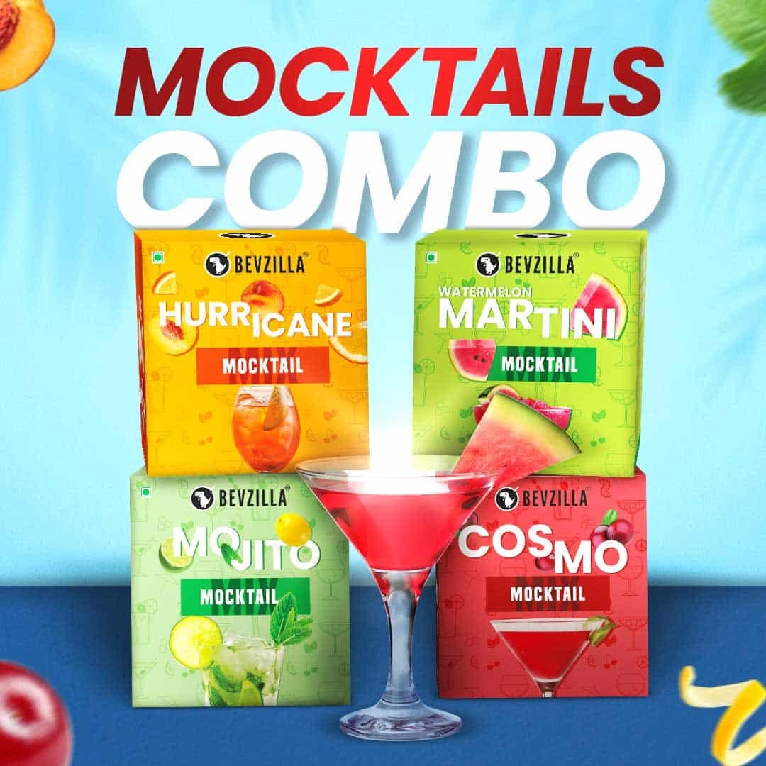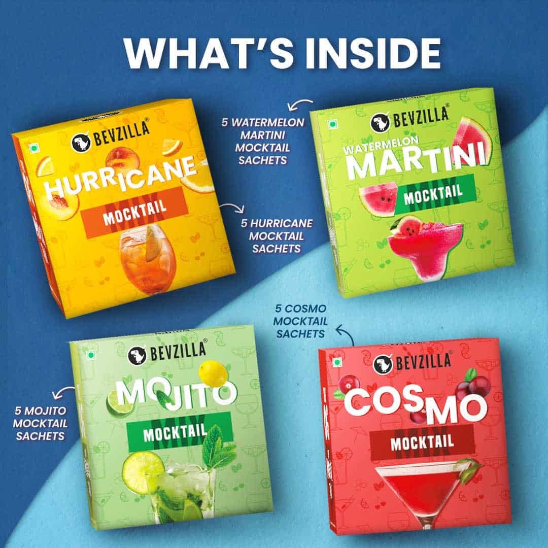 Details: Experience the ultimate party vibes with Bevzilla Mocktail Mixer Powder! This vibrant 4-flavor box brings you refreshing mixes of Hurricane, Watermelon Martini, Mojito and Cosmo pouch is non-alcoholic and low-calorie, offering a deliciously guilt-free drink for any occasion. Just mix, stir, and sip—perfect for parties, picnics, or a relaxing treat at home. Enjoy bar-quality mocktails in seconds with Bevzilla, where every sip feels like a celebration!