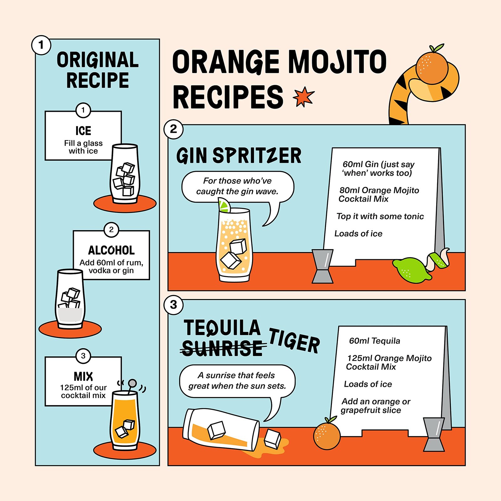 - Whats In The Box? A recipe card and a little something about the genet code of tipsy tiger. There aren’t too many of us, out there, you know. But with you, we can surely increase the population. So, we are sending you 3 bottles (250ml each) of tipsy tiger cocktail mixer, packed in a strong but recyclable paper box. 1/2 Bottle = 125ml = makes 1 cocktail. That’s 6 drinks from this pack