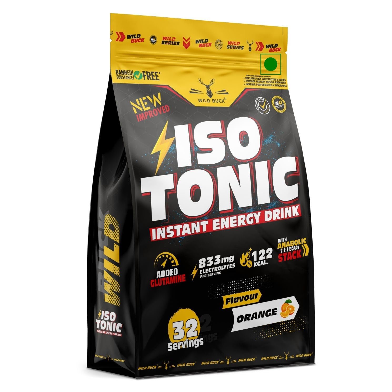 Wild Buck Isotonic Instant Energy Drink Formula, Extended Workout Electrolyte Energy Drink with Anabolic Stack 2:1:1 BCAA, Dextrose Monohydrate and L-Glutamine | 833mg Electrolytes [32 Servings, Orange Flavor]