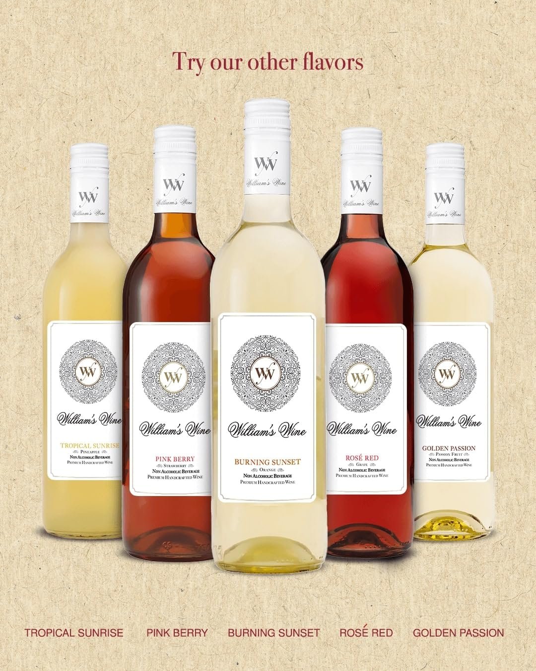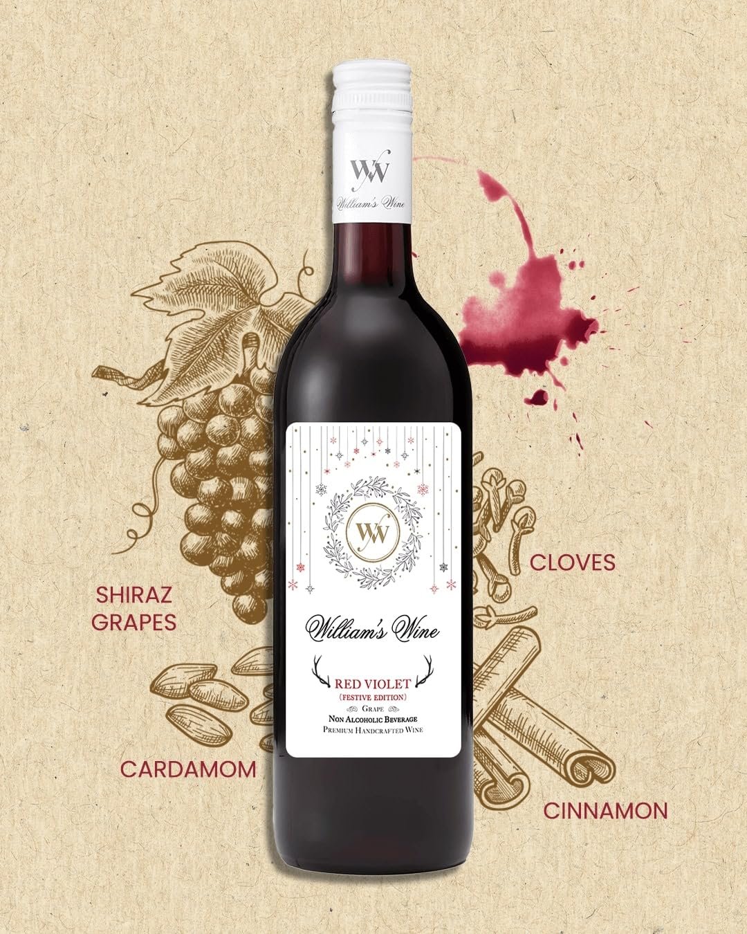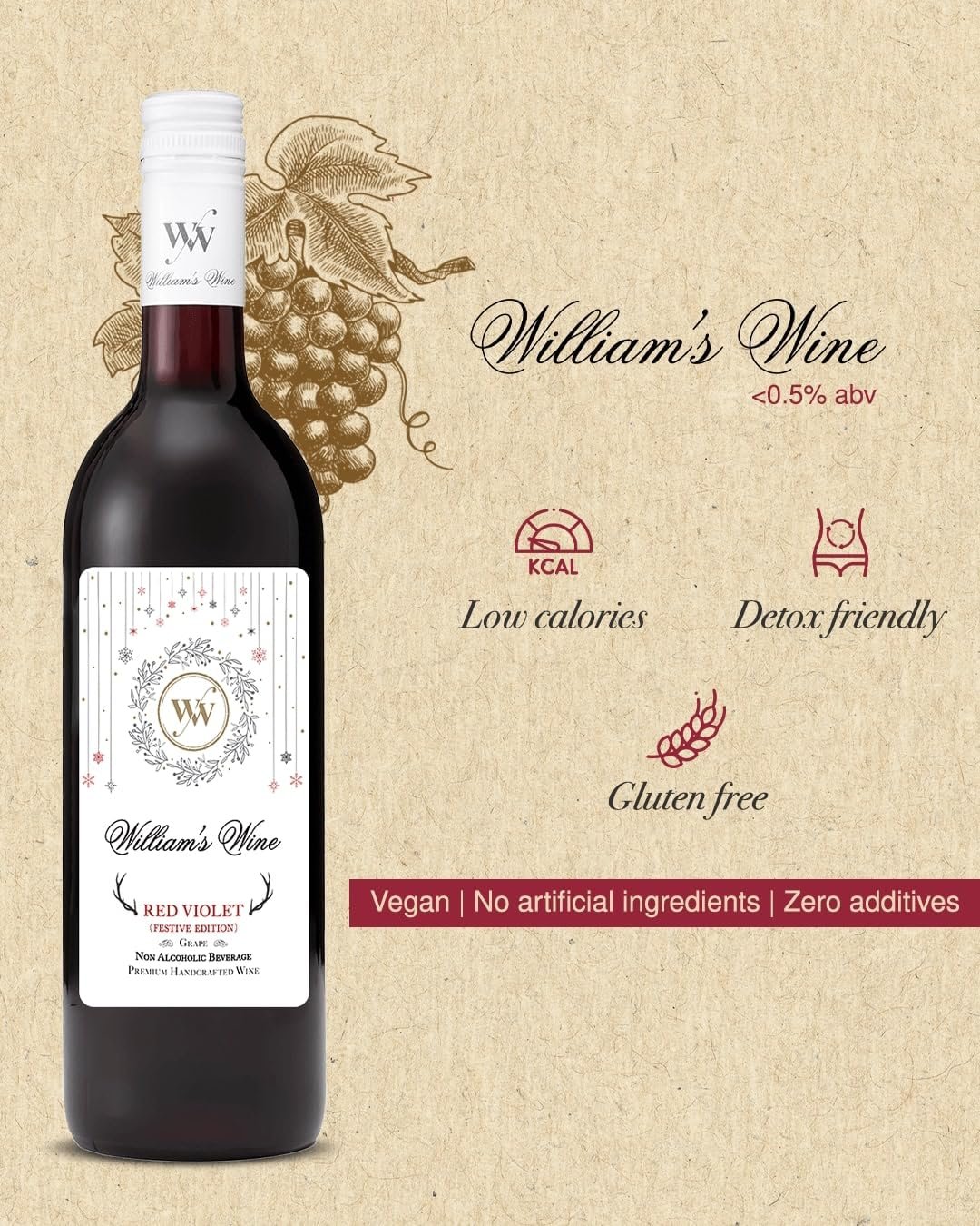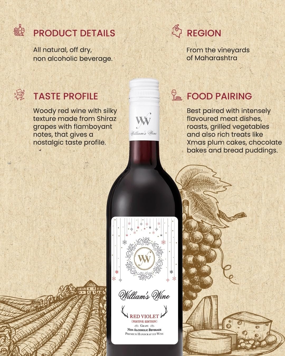 - INFINITE SENSORY EXPERIENCE: William’s Wine Non Alcoholic Red Violet is a light-bodied fruit beverage with a rich aroma and light tannic structure, balanced with hints of spice and oak bouquets for an accent of depth and texture with every sip.