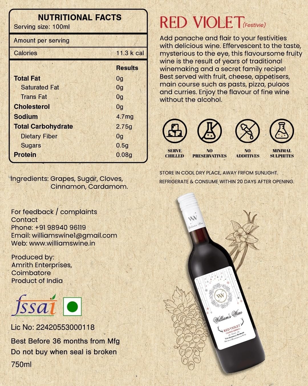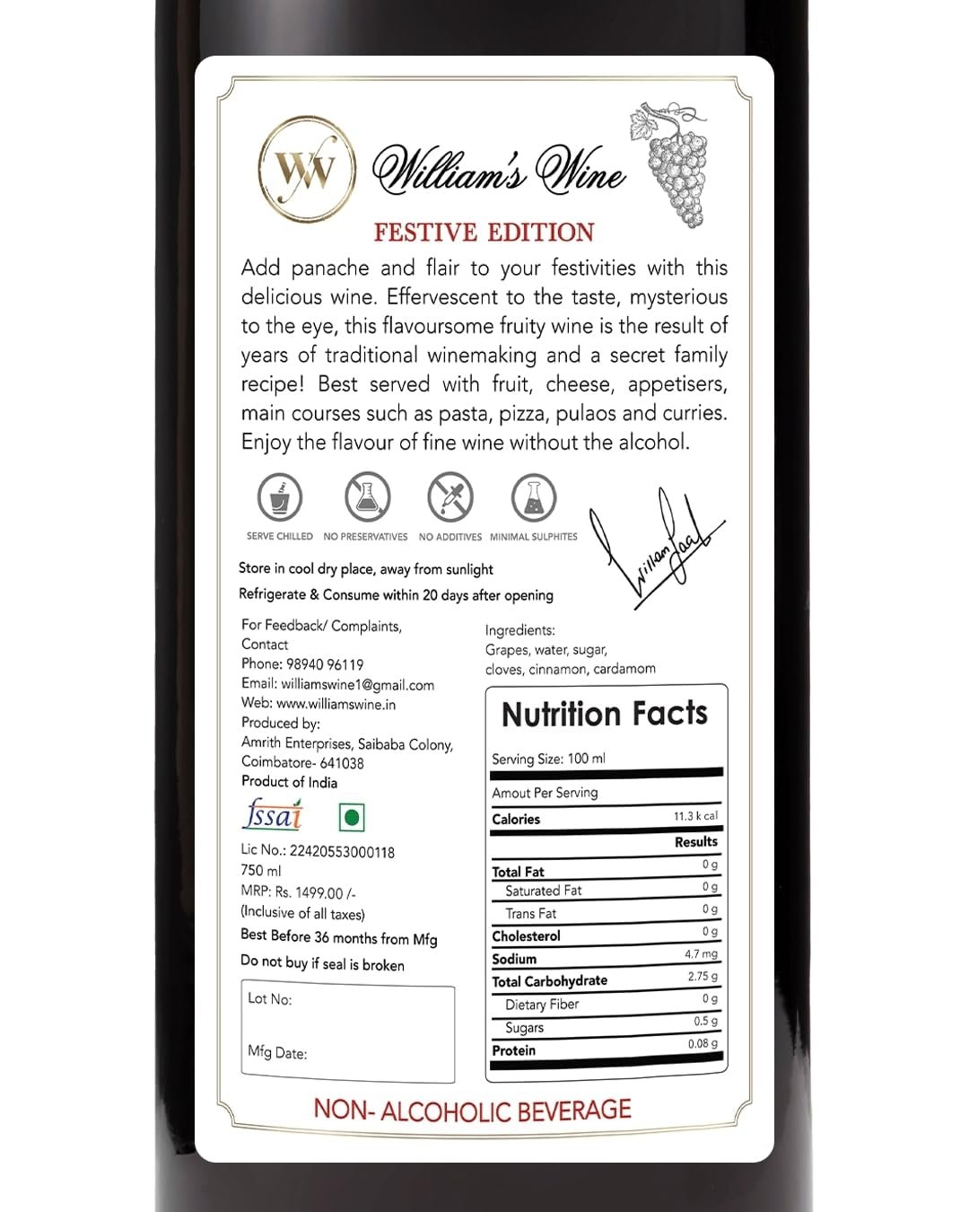 - SERVING & STORAGE INSTRUCTIONS: Our fruit beverage tastes best when chilled. Once opened, sip and savour your William’s Wine within 20 days.