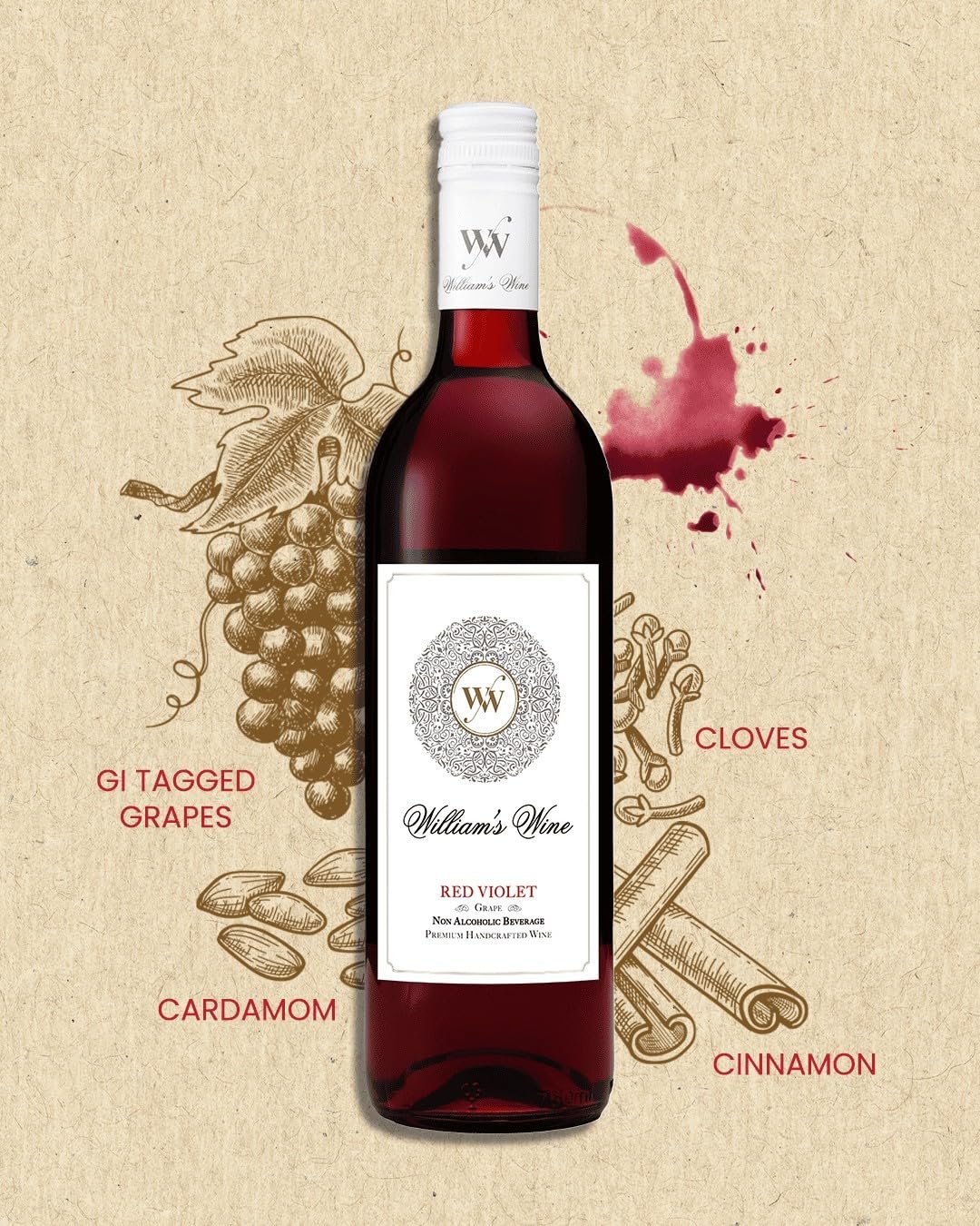 - INFINITE SENSORY EXPERIENCE: William’s Wine Non Alcoholic Red Violet is a light-bodied fruit beverage with a rich aroma and light tannic structure, balanced with hints of spice and oak bouquets for an accent of depth and texture with every sip.